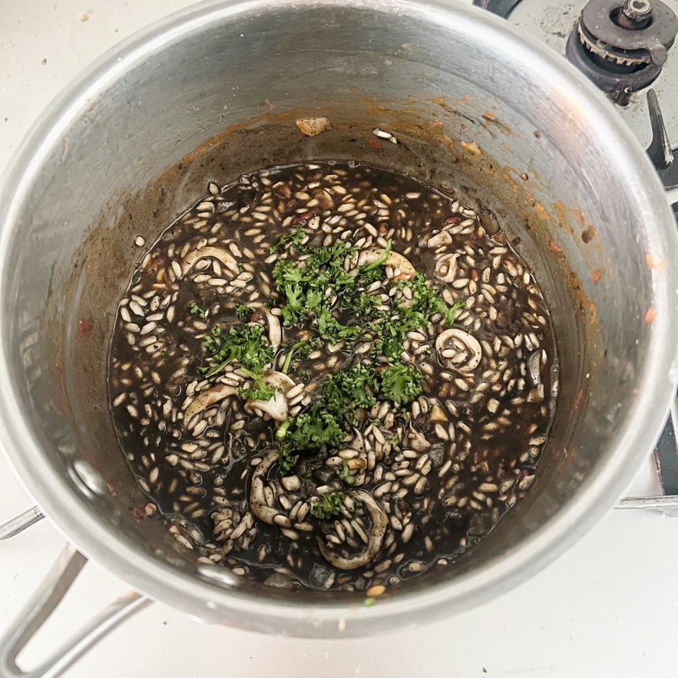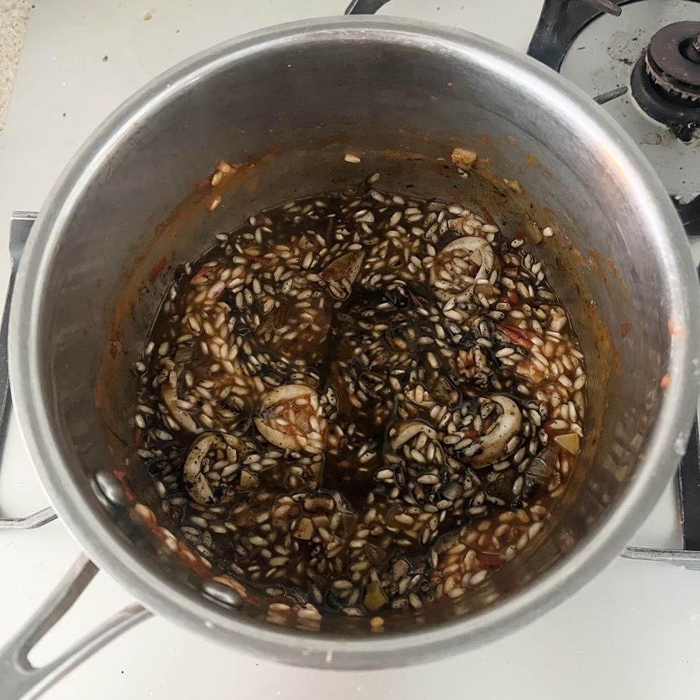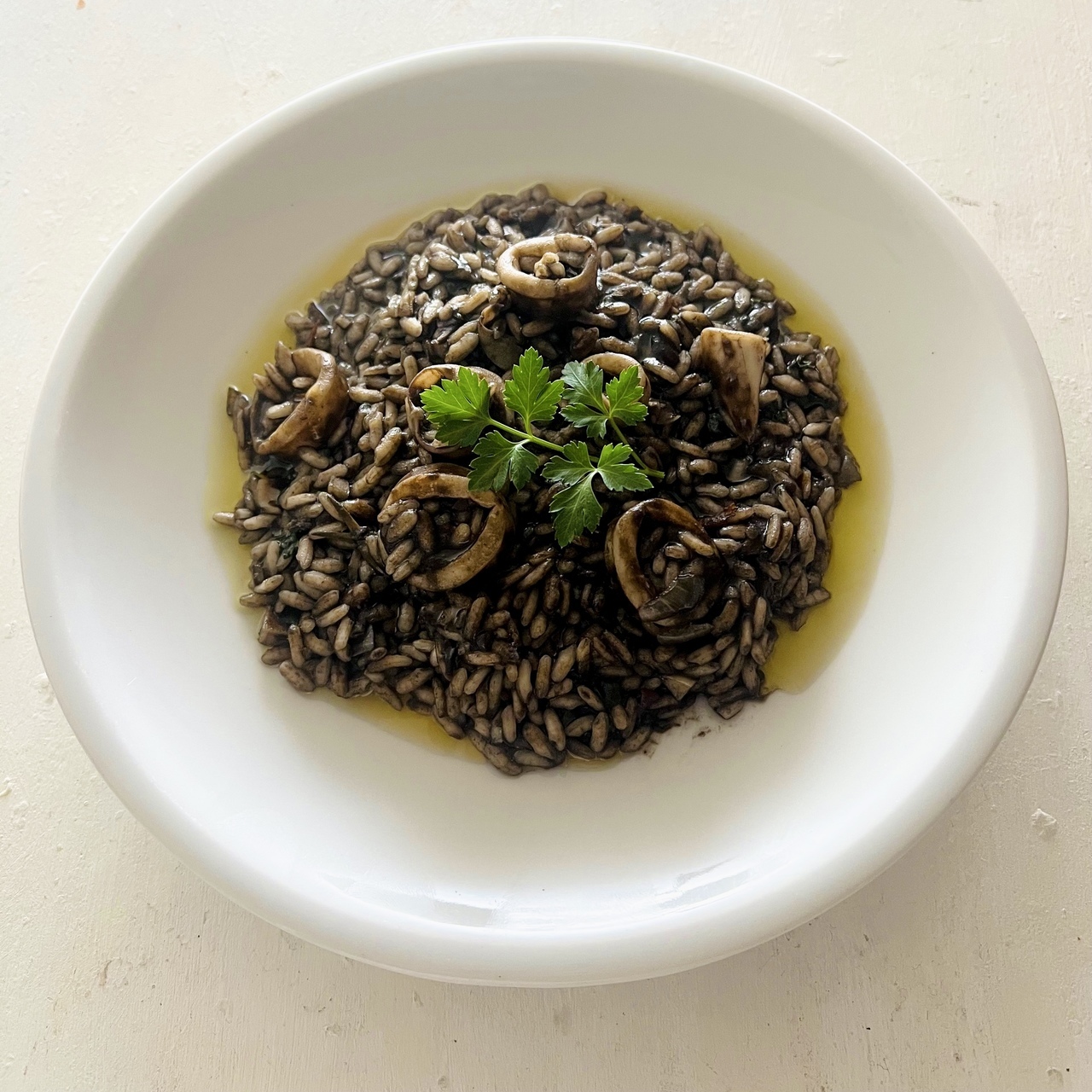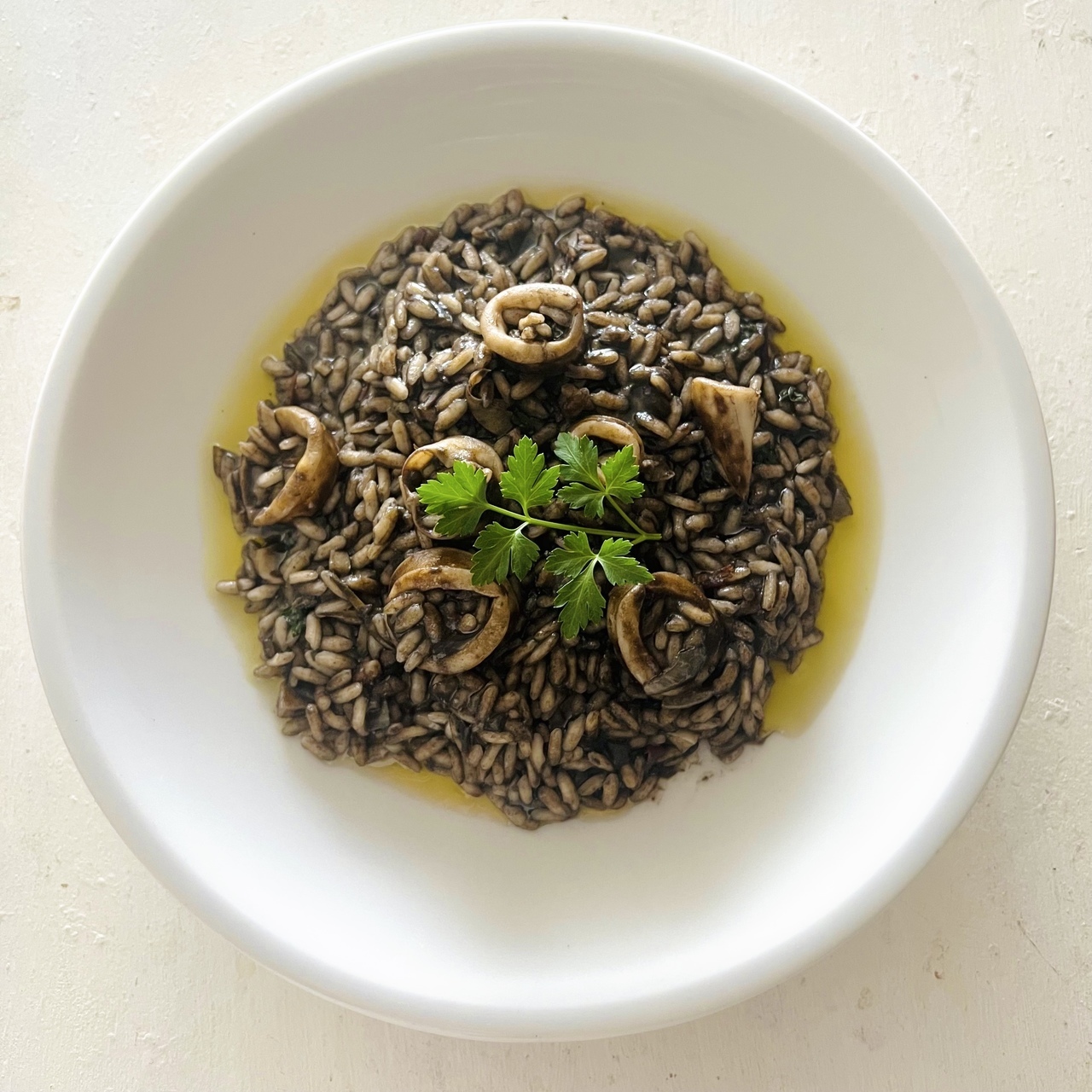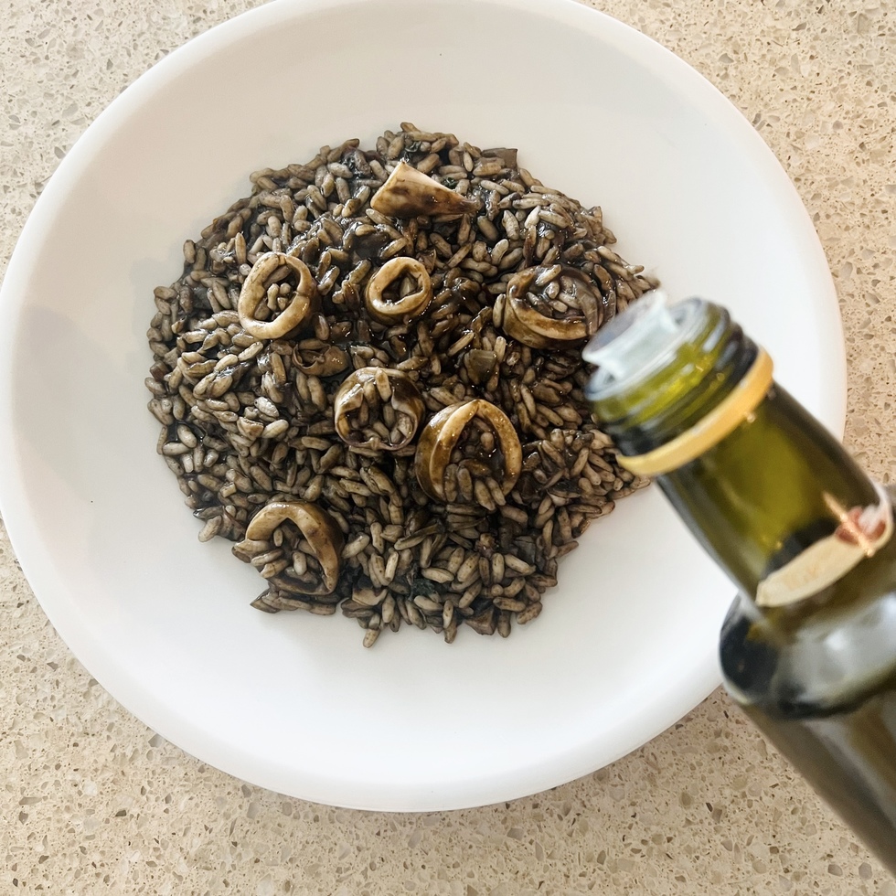 イカの旨味と墨のコクを生かした、シンプルながら奥行きのあるリゾットです。玉ねぎとにんにくを弱火で炒め、アンチョビとイカの風味を重ねたベースに白ワインとトマトの爽やかな酸味をプラス。米は温かいブイヨンを少しずつ加えながら炊き上げ、仕上げにバターでなめらかにまとめます。固形チキンブイヨンは規定の半量で薄めて使用し、魚の出汁があればより本格的な味わいに仕上がります。