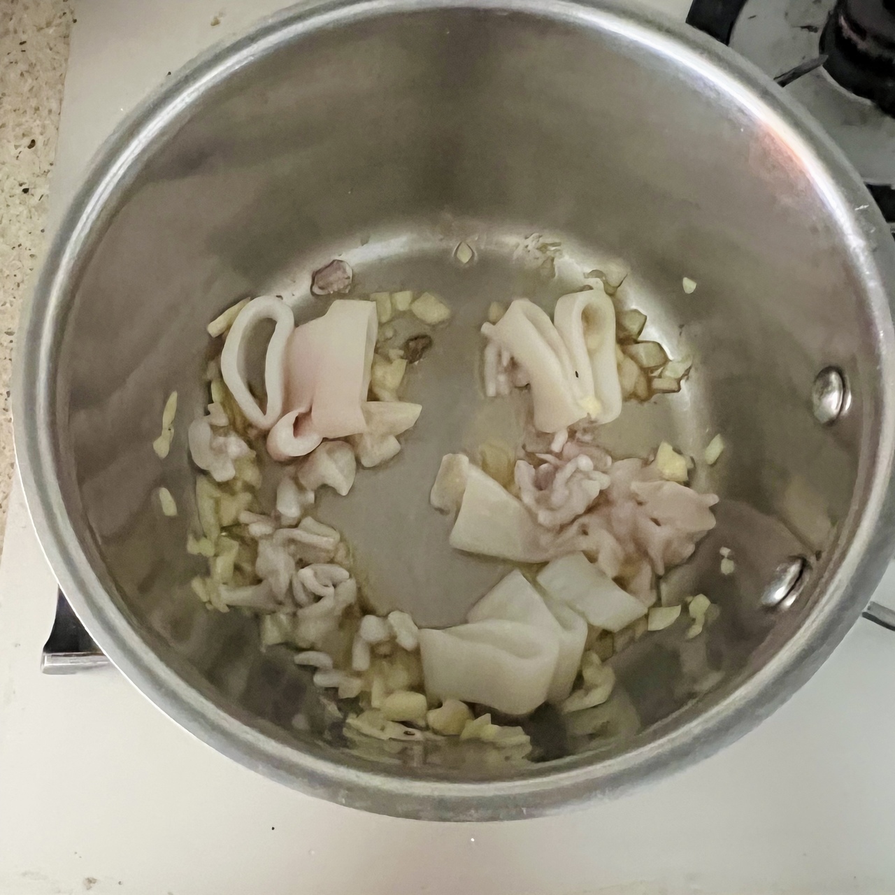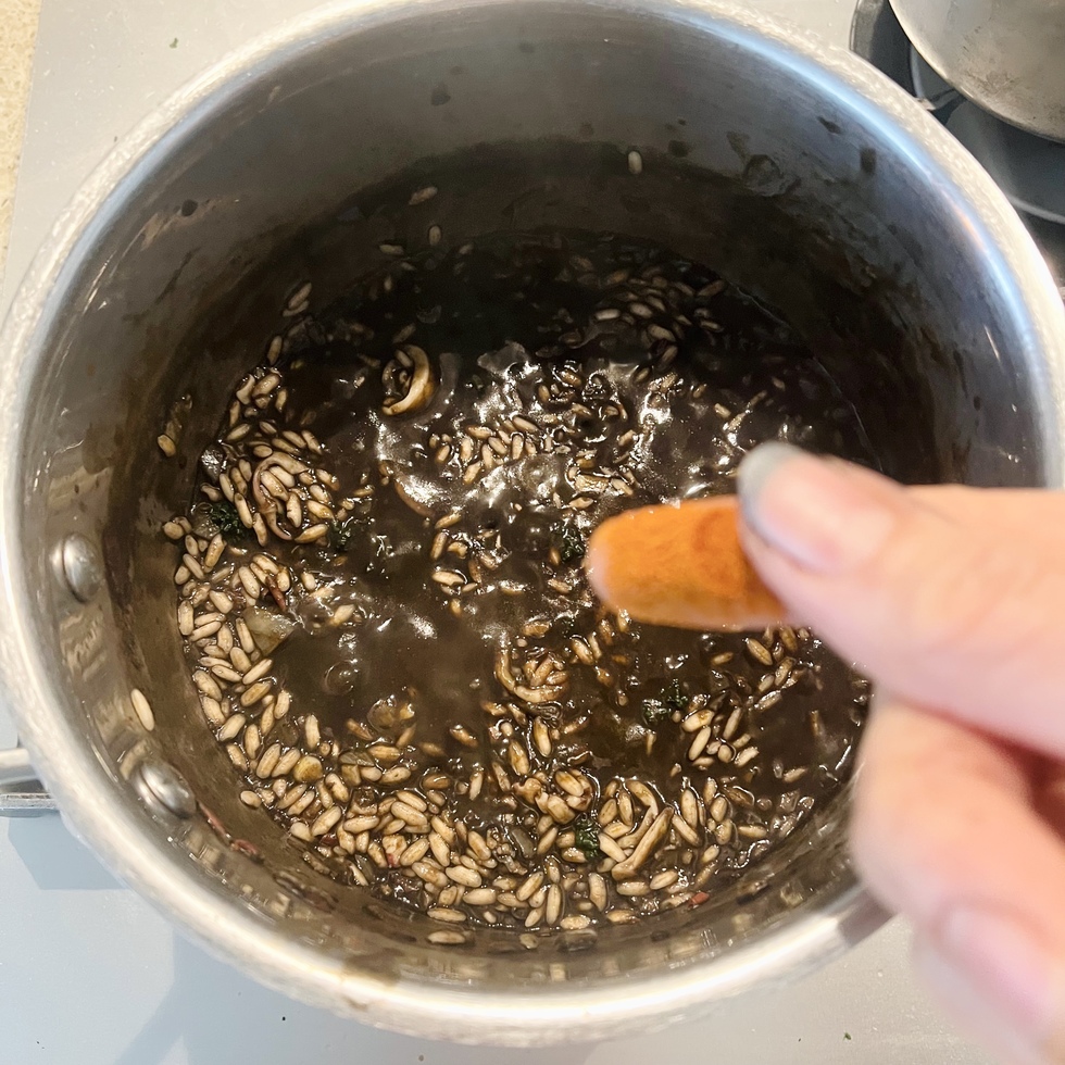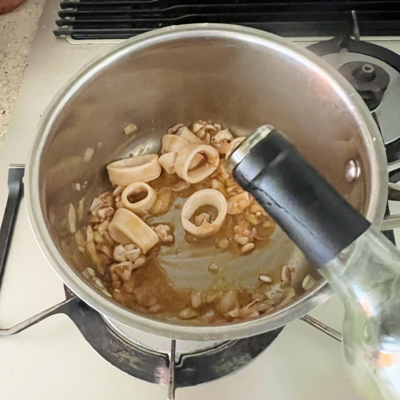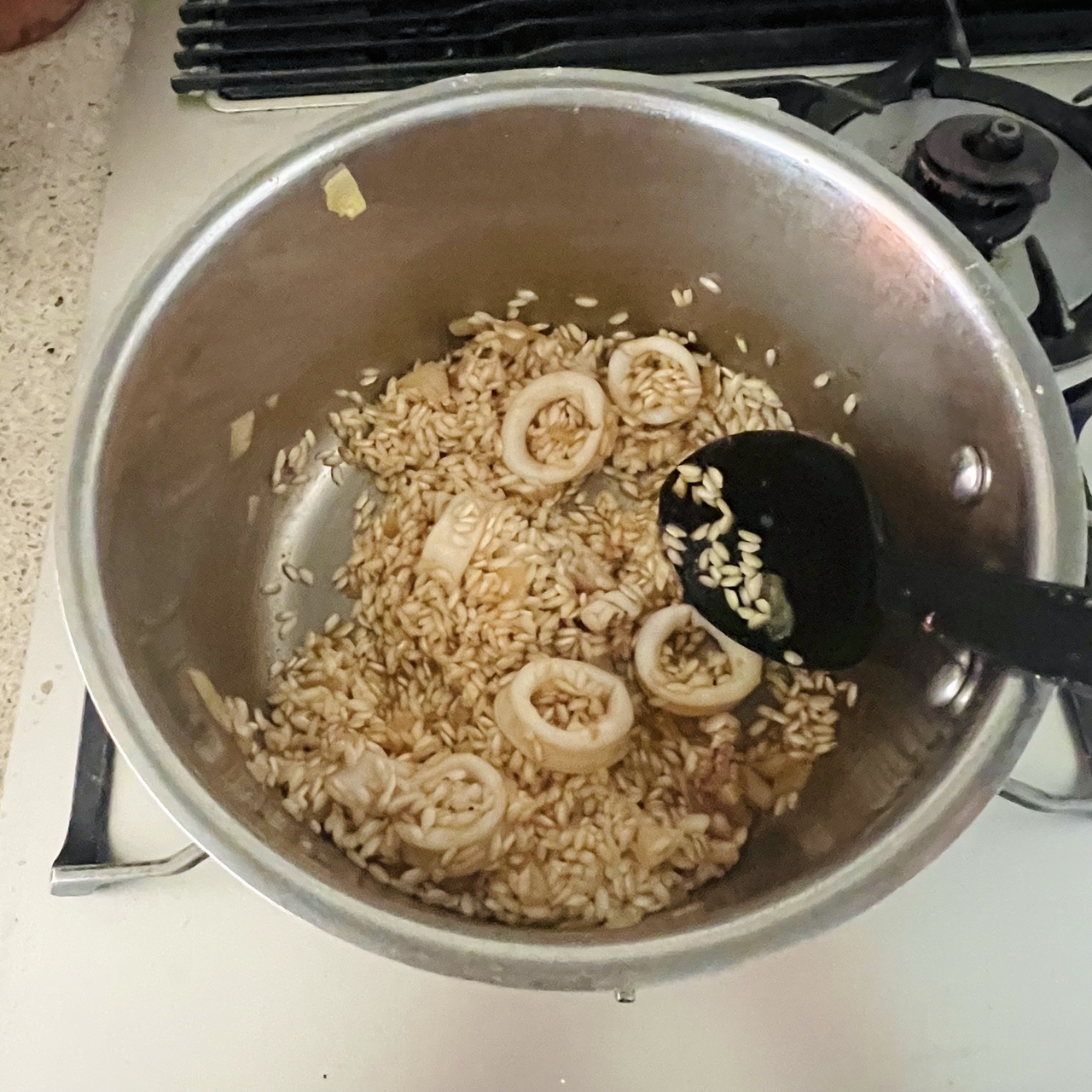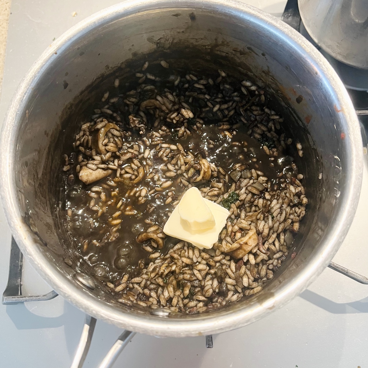 イカの旨味と墨のコクを生かした、シンプルながら奥行きのあるリゾットです。玉ねぎとにんにくを弱火で炒め、アンチョビとイカの風味を重ねたベースに白ワインとトマトの爽やかな酸味をプラス。米は温かいブイヨンを少しずつ加えながら炊き上げ、仕上げにバターでなめらかにまとめます。固形チキンブイヨンは規定の半量で薄めて使用し、魚の出汁があればより本格的な味わいに仕上がります。